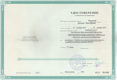 Курсы повышения квалификации: 2013г. МАОУ ДПО «Институт повышения квалификации», «Учебно-исследовательская деятельность учащихся в условиях введения ФГОС» (72 часа).